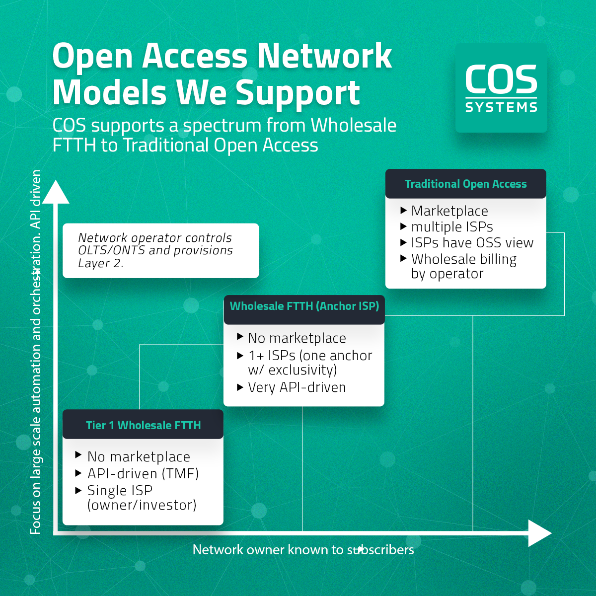 COS Business Engine is a powerful solution for Open Access (OA) networks that leverages end-to-end automation to simplify complex, multi-provider ecosystems. Designed as a comprehensive BSS/OSS platform, COS Business Engine enables zero-touch provisioning, automated billing, and a self-service marketplace, allowing multiple service providers to offer competitive services directly to customers. This approach maximizes network utilization, boosts take rates, and reduces operational burdens. Business Engine also supports municipalities and communities in retaining control over infrastructure investments, ensuring long-term financial viability and alignment with public interests, while delivering high-quality broadband access through diverse service provider options.
